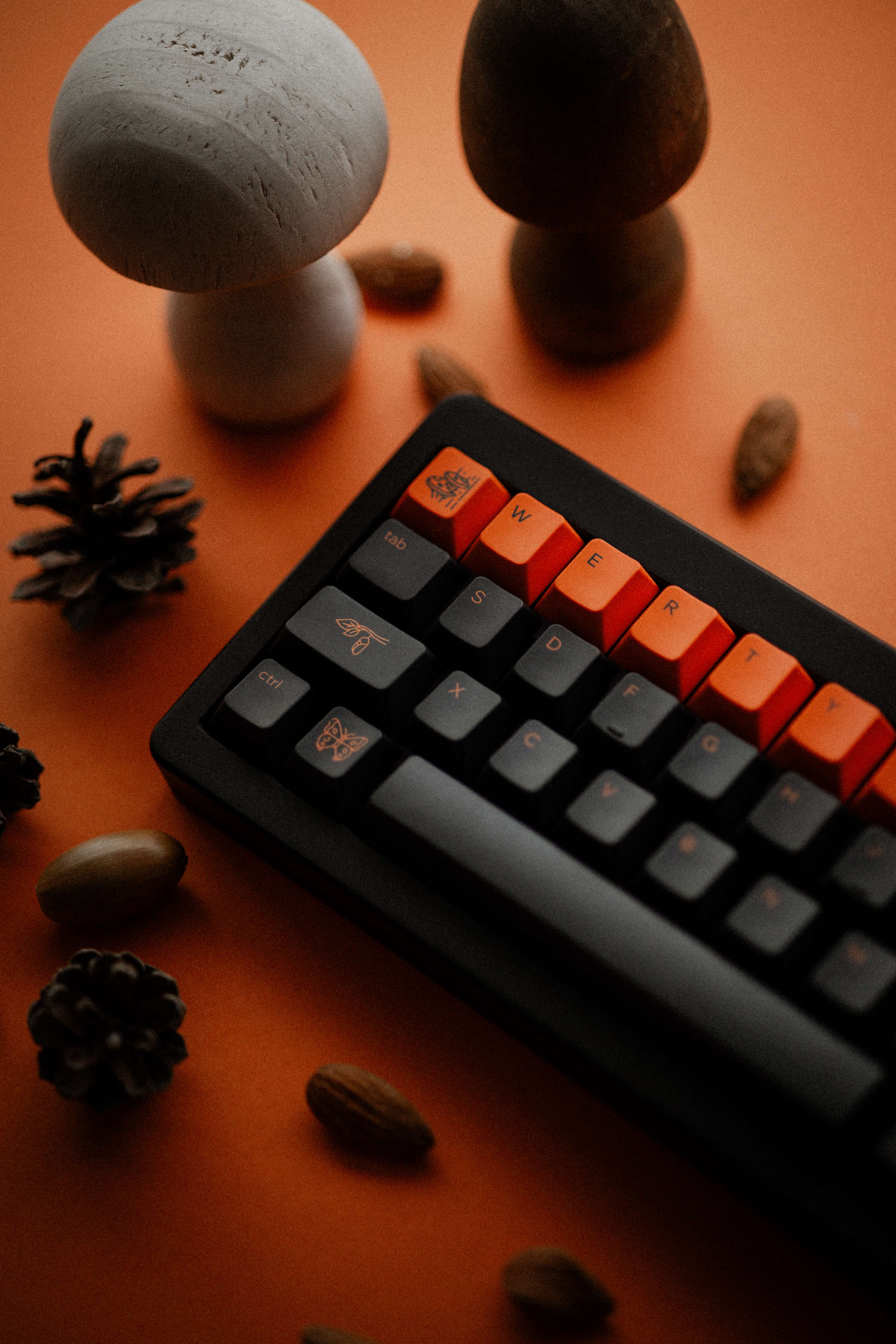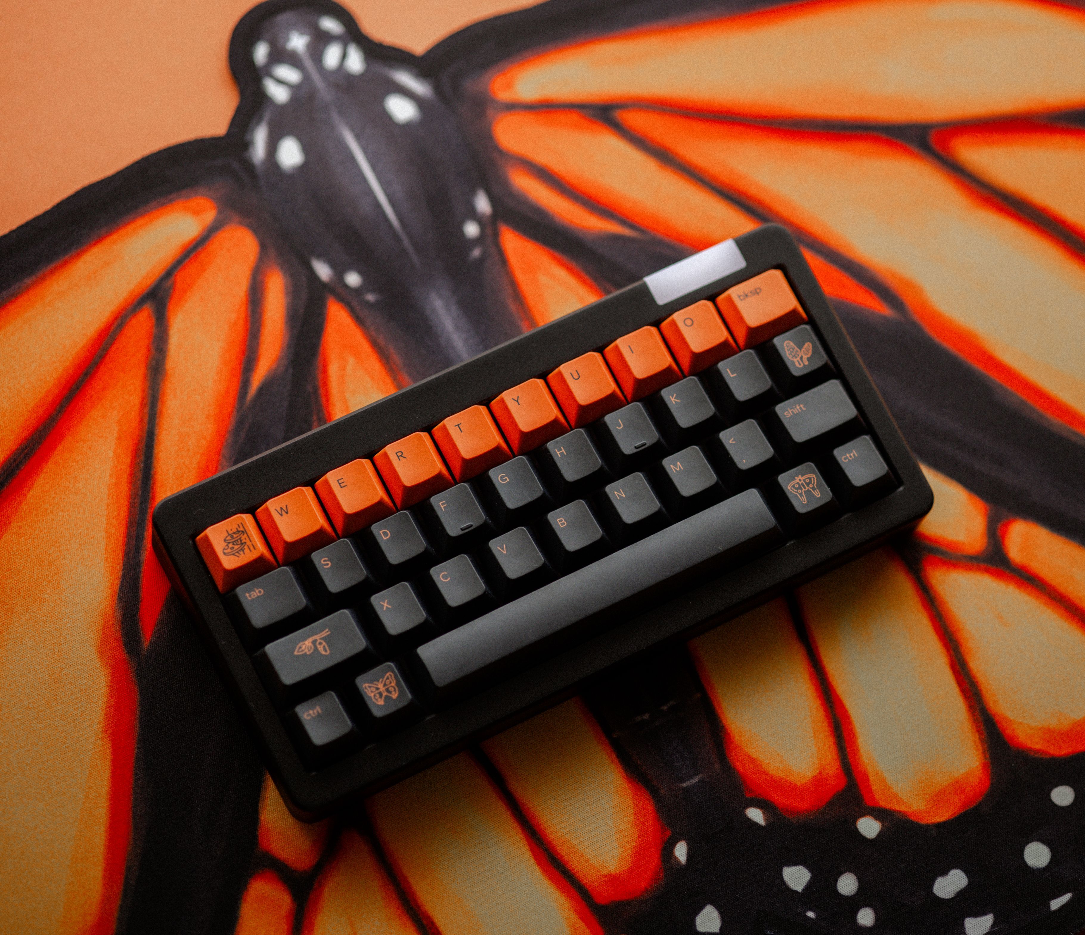 Inspired by the Monarch Butterfly deskmat by Mooko studio, I wanted to make a keycap set to match this beautiful mat without taking too much attention away from it. Themed forest with butterflies, mushrooms, insects and moths and autumn colors this is the finished product and I adore the simplicity with a pop of color.