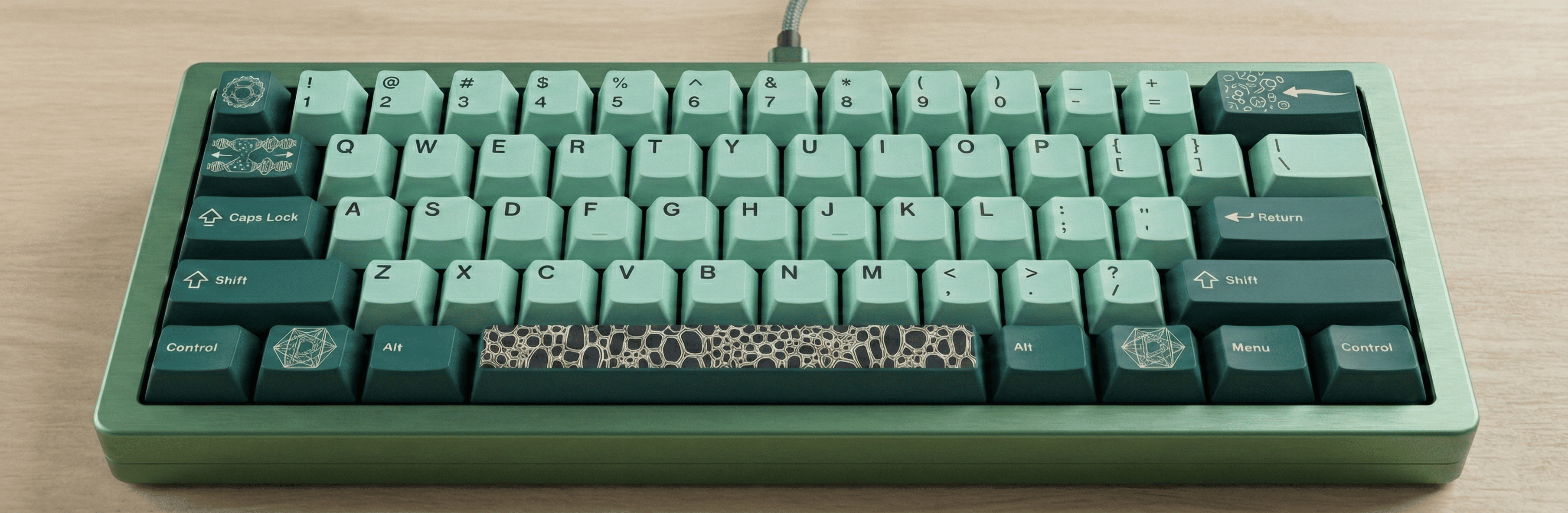 Inspired by the realm of microbiology with hints of geometry, the mint and dark teal color palette evokes an organic, scientific laboratory feel. The special designs pay tribute to the fundamental building blocks of life, featuring geometric virus structures, DNA helices, and a dense cellular pattern on the spacebar.