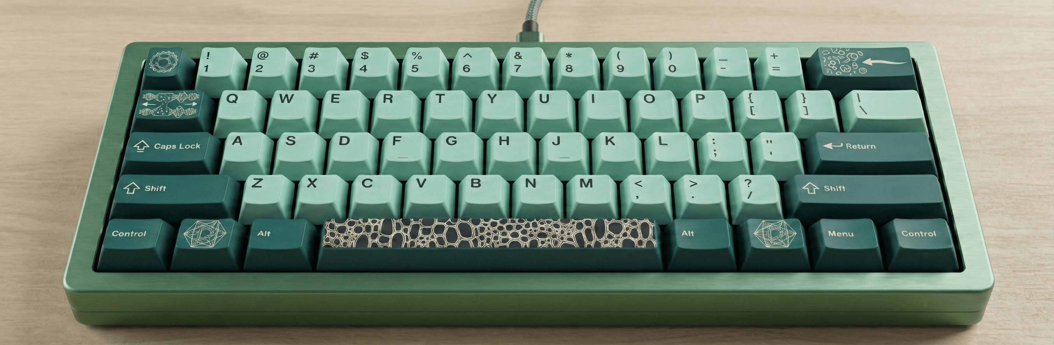 Inspired by the realm of microbiology with hints of geometry, the mint and dark teal color palette evokes an organic, scientific laboratory feel. The special designs pay tribute to the fundamental building blocks of life, featuring geometric virus structures, DNA helices, and a dense cellular pattern on the spacebar.