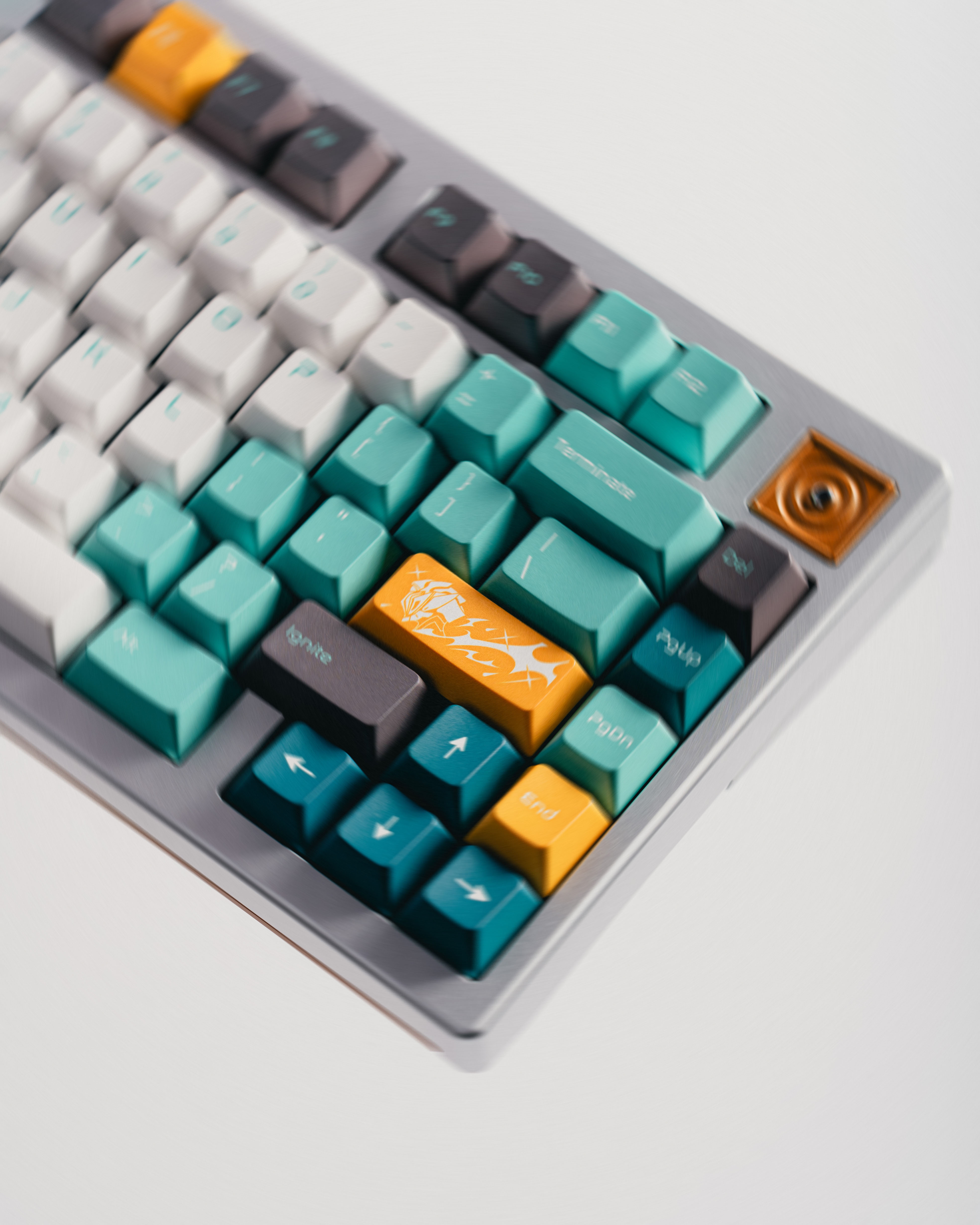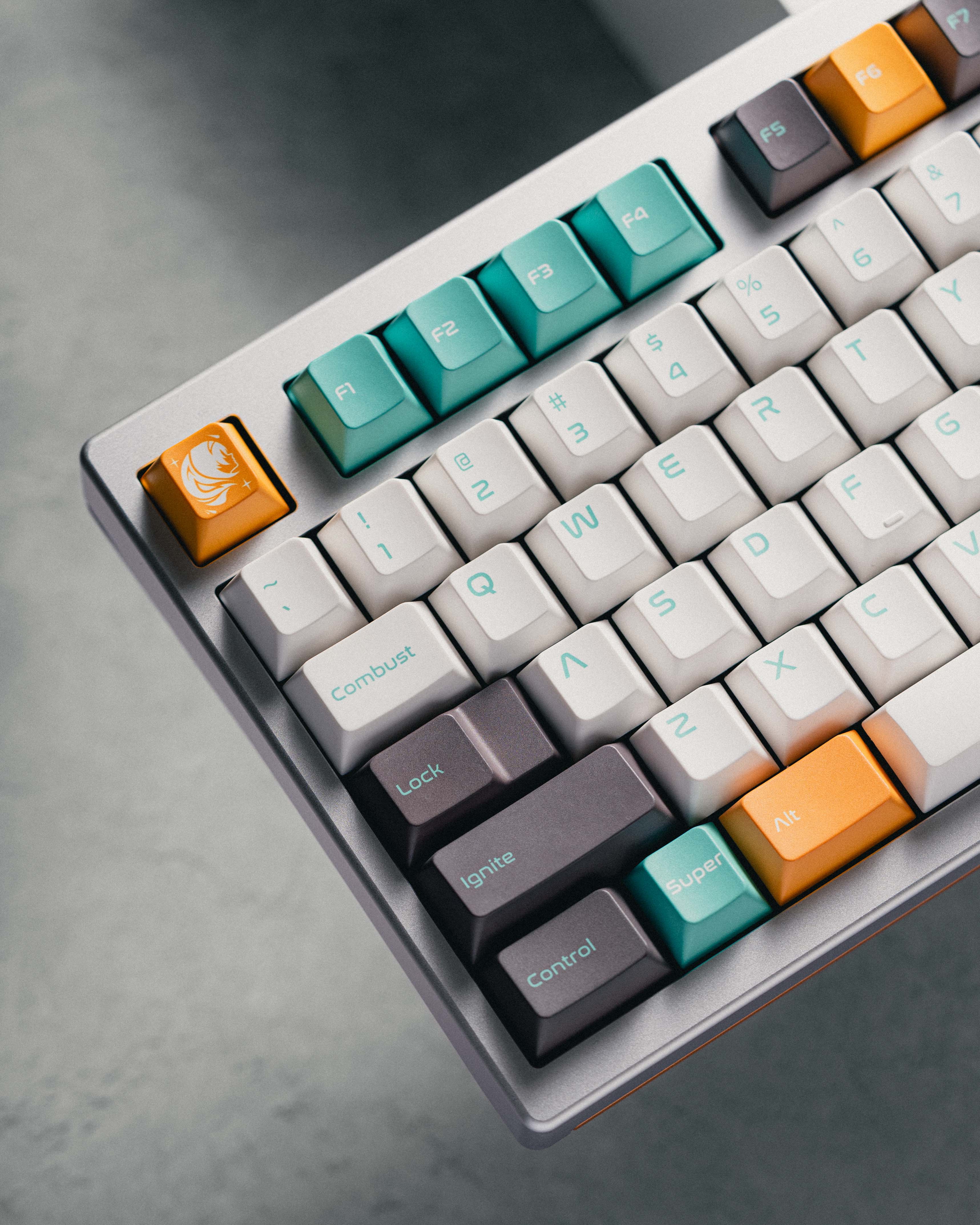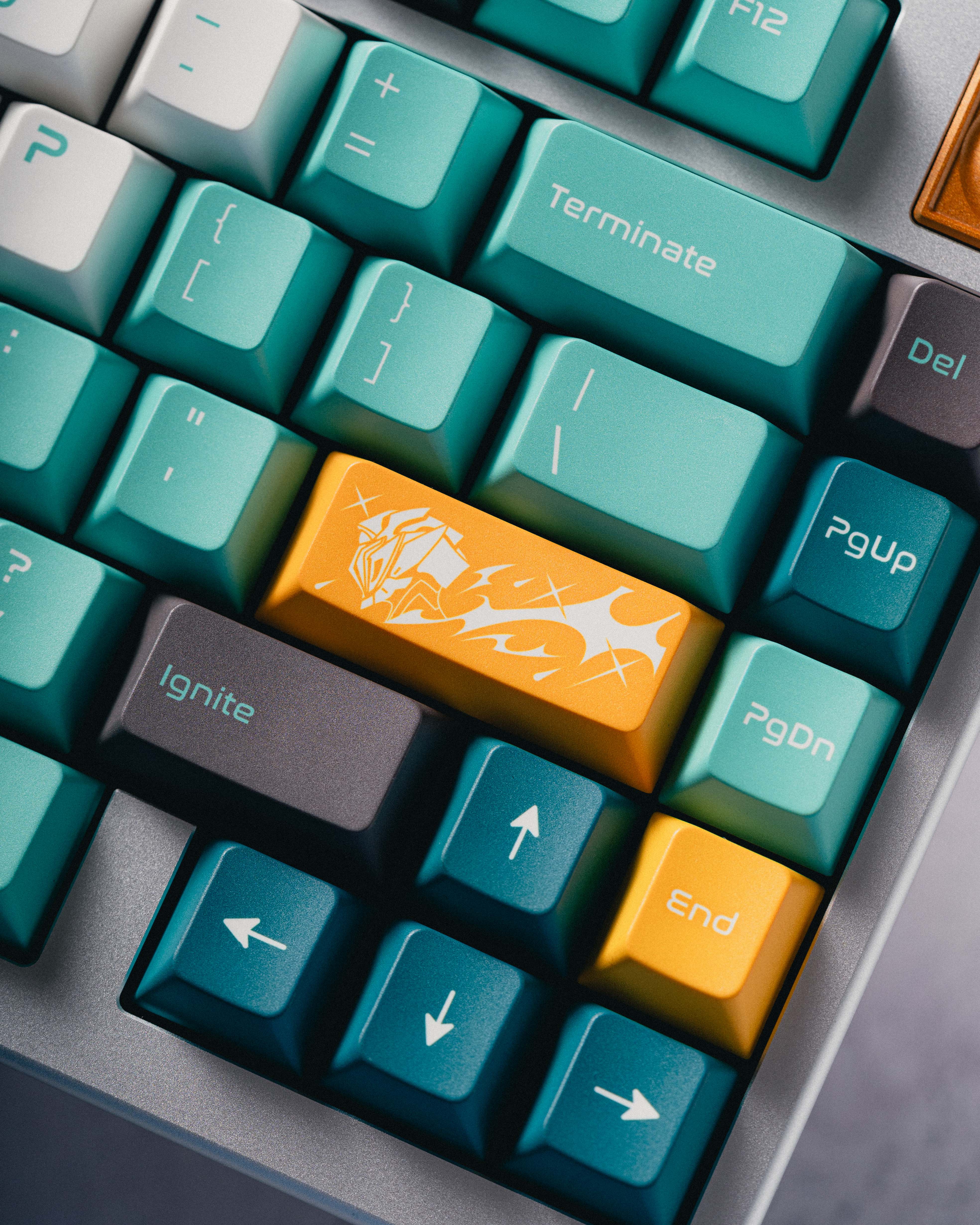 Firefly is a set I designed based off of, well, Firefly from HSR. She's one of my favorite characters to play as and I love the energy their play style provides. I wanted to capture the essence of the warm oranges and cool teals of her color palette and how well they compliment each other. I partnered up with Seo_bun for the novelty designs to tie the whole set together.